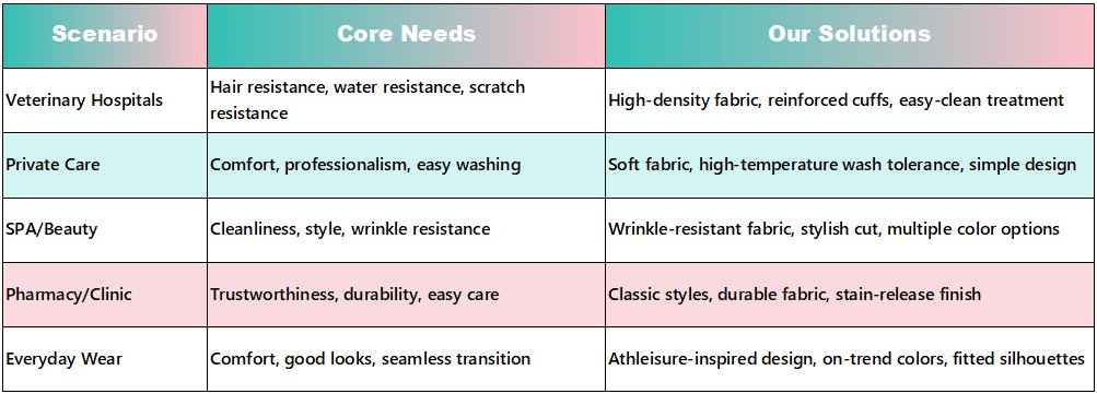 Veterinary Hospitals & Grooming Salons: With the explosive growth of the pet economy, demand for professional workwear in veterinary clinics and grooming salons has surged. Veterinarians and groomers deal daily with pet hair, bathing water, disinfectants, and even the risk of scratches and bites. Medical scrubs – known for their easy-to-clean, durable, and functional pocket designs – have become ideal for this industry. Some pet hospitals even choose scrubs with cute prints or bright colors to help calm nervous pets and owners.